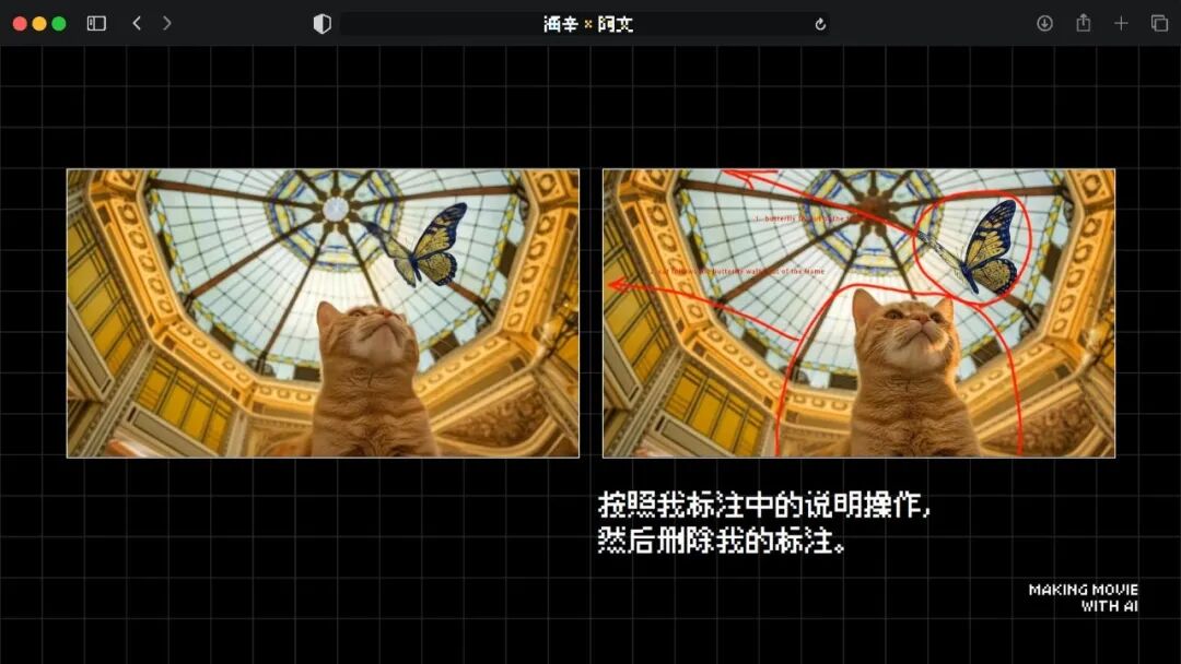 但在首帧上画涂鸦给运动指示,比如让蝴蝶往哪飞,猫跟着往哪走,再加一句提示词“按照标注中的说明操作,然后删除我的标注”,模型就会按你标注的运动规则生成,猫可以顺利走出画外。