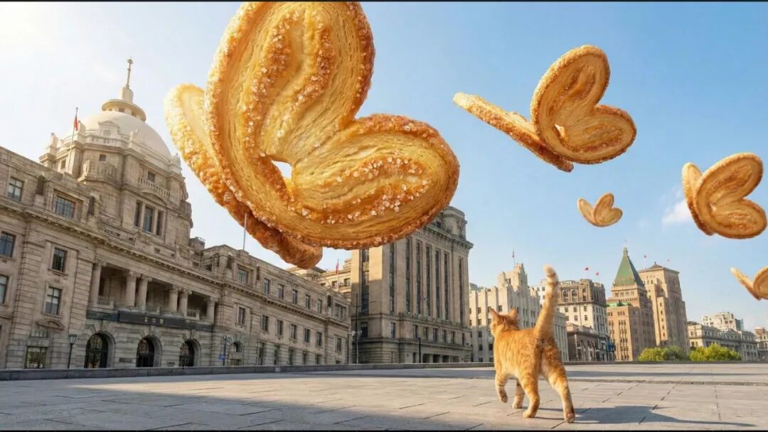 一个是上海观众很喜欢问的“蝴蝶酥”。上海蝴蝶酥很有名,我们确实做过一只巨大的蝴蝶酥,而且画面我们很喜欢。但 AI 里蝴蝶酥一动就会变回真实蝴蝶,始终飞不起来,所以只能放弃。