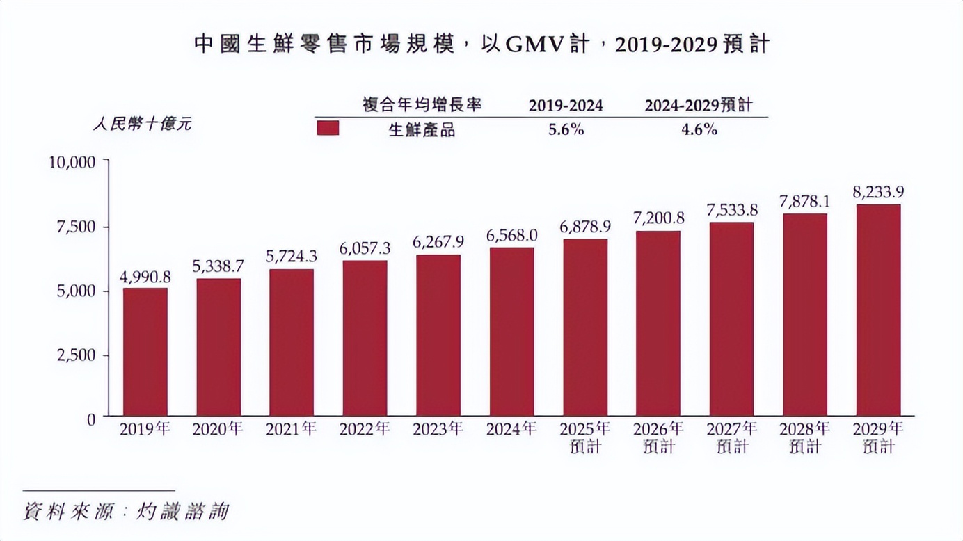 中国生鲜零售市场2024年规模为6.56万亿元,其中菜市场占3.5万亿元,非菜市场3.06万亿元;据预测,这一市场规模有望在2029年扩张至8.23万亿元。