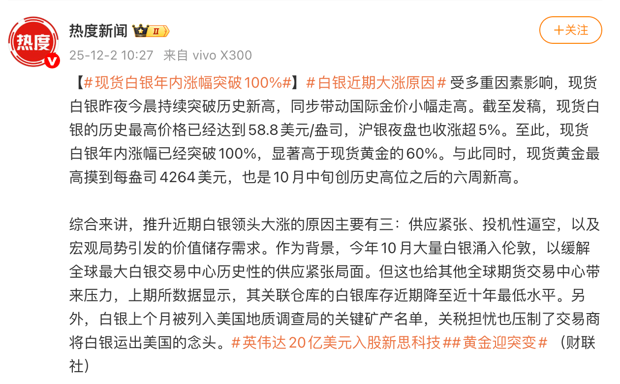 据悉近两日黄金价格出现剧烈波动,12月1日白银创历史新高(58.84美元/盎司),黄金同步反弹至4265美元/盎司,但次日早盘双双低开,纽约金跌0.15%,纽约银跌1.15%。