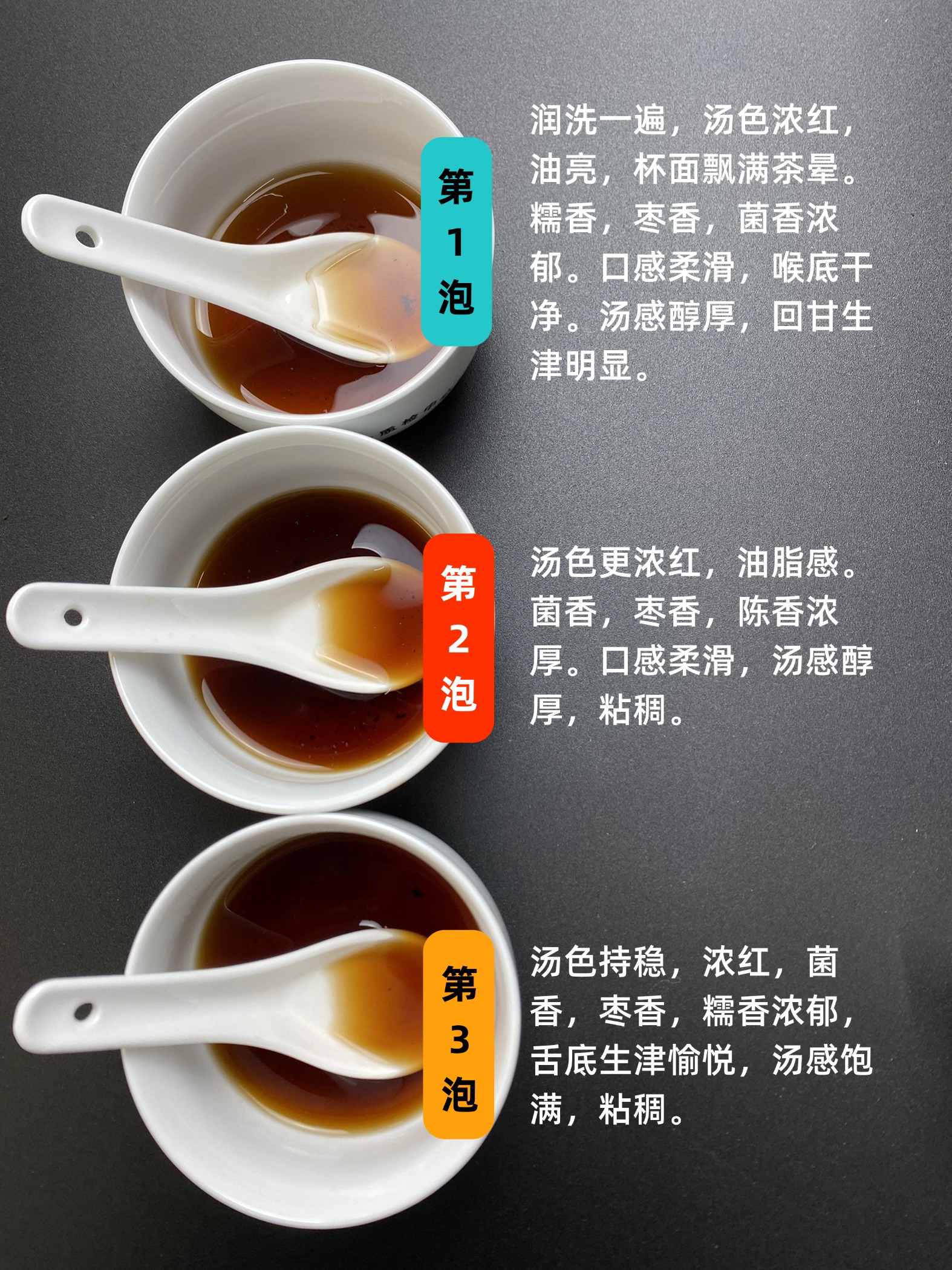第三泡,汤色持稳,浓红,菌香,枣香,糯香浓郁,舌底生津愉悦,汤感饱满,粘稠。
