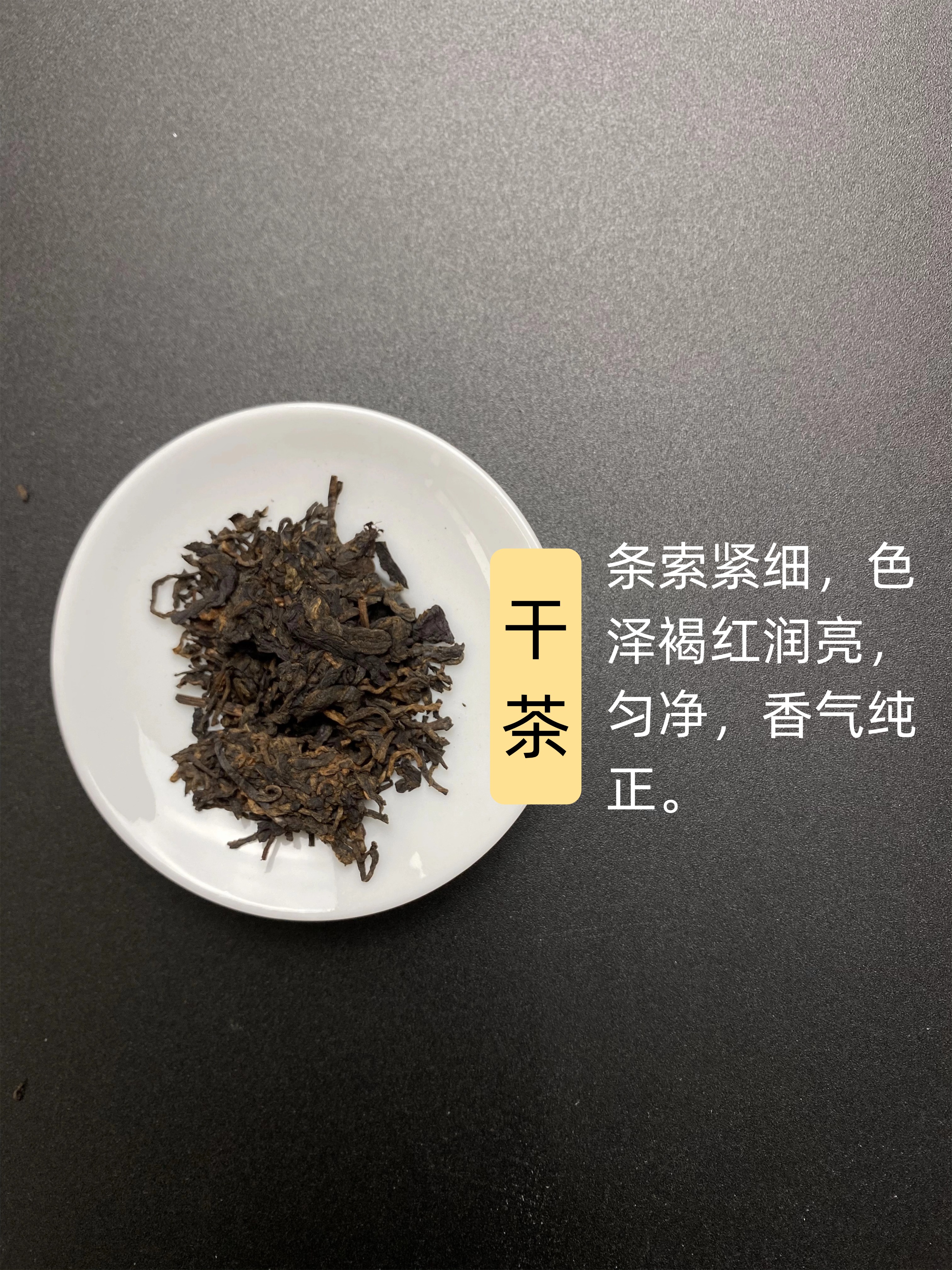 干茶,条索紧细,色泽褐红润亮,匀净,香气纯正。
