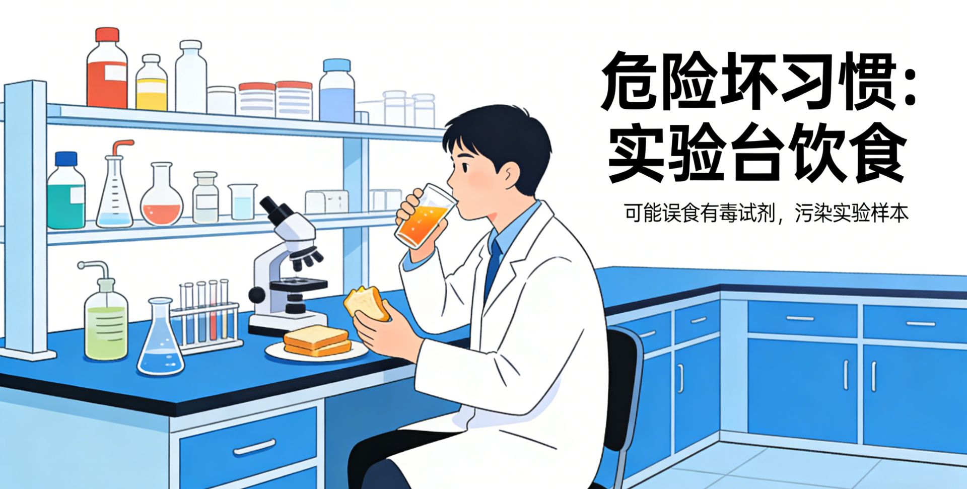 潜在危害:化学试剂、实验样品易污染食物和饮用水,误食后会引发中毒、肠胃不适等问题;实验过程中产生的有毒气体、粉尘会附着在食物表面,长期摄入会危害人体健康;同时,水杯、食物容器可能被试剂污染,进而污染实验样品,影响实验结果。