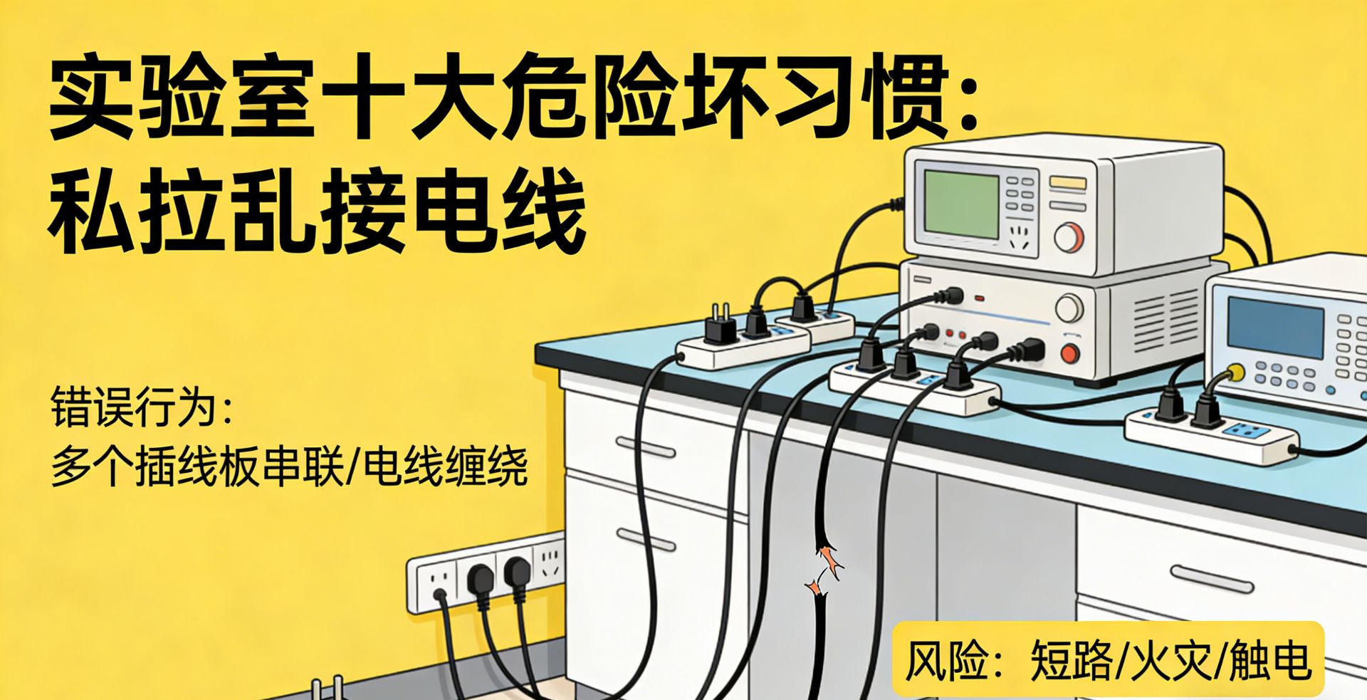 潜在危害:明火与易燃试剂、挥发性气体接触,易引发火灾、爆炸;私拉乱接电线、违规使用大功率电器,会导致电路过载、短路,引发火灾;破损、老化的电线和插头易发生漏电,造成人员触电事故。