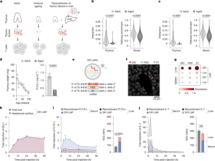 研究团队筛选了三个关键靶点:DLL1(激活Notch信号通路的跨膜配体)、FLT3 - L(促进淋巴祖细胞增殖)和IL - 7(维持T细胞生存的核心细胞因子)。他们将编码这三个蛋白的mRNA用SM - 102 LNP包裹,每周注射两次,持续四周。