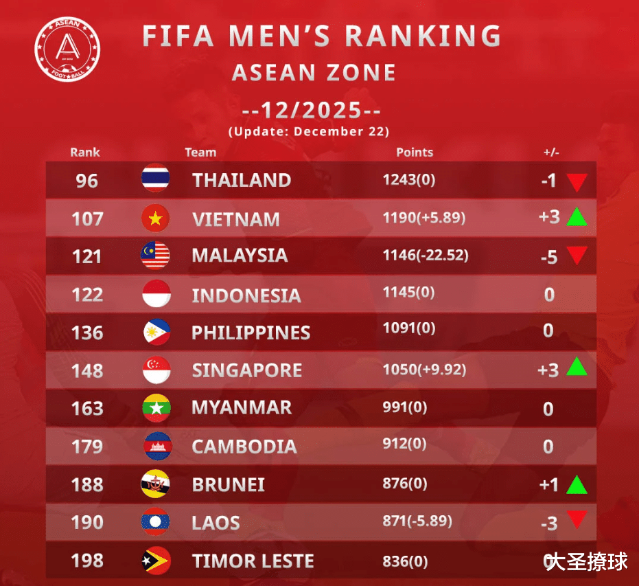 与此同时,马来西亚队的排名也遭遇了下滑。由于归化球员身份造假的丑闻,他们的3场友谊赛结果被判负,被扣掉22.52分,排名下降5位,来到第121位。