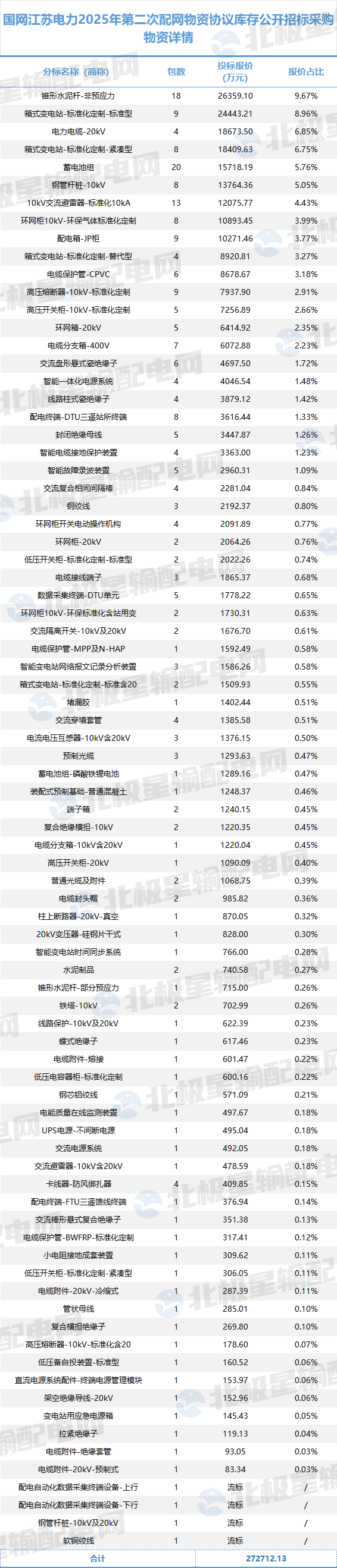 11月17日,国网江苏电力2025年第二次配网物资协议库存公开招标采购推荐的中标候选人公示。本次招标共82项物资,266个物资包,产生投标报价共计约272712.13万元。