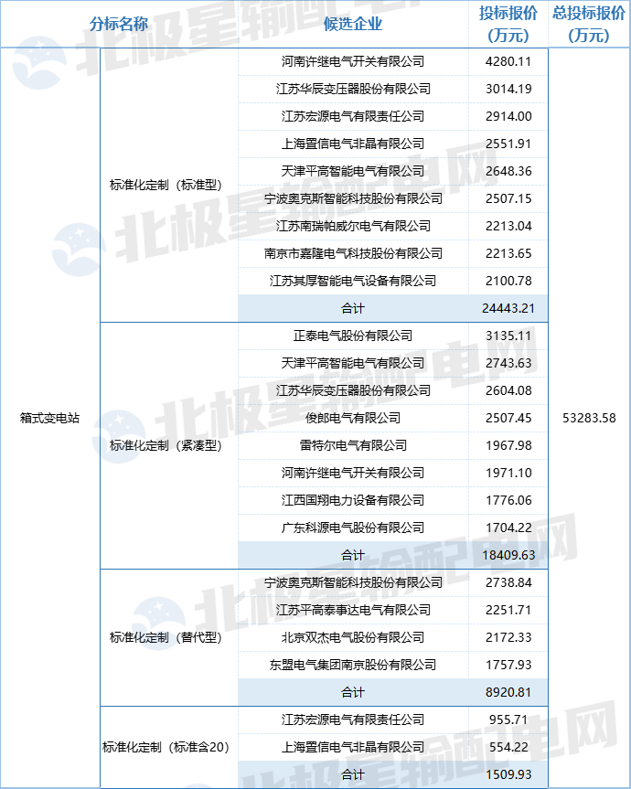 本次招标共有203家企业入围中标候选人,其中天津平高智能电气有限公司投标报价最高,共计约7178.98 万元,入围3个标包,入围物资包括箱式变电站、高压开关柜。其次为宁波奥克斯智能科技股份有限公司,投标报价约6471.44 万元,入围3个标包,入围物资包括箱式变电站、低压开关柜。