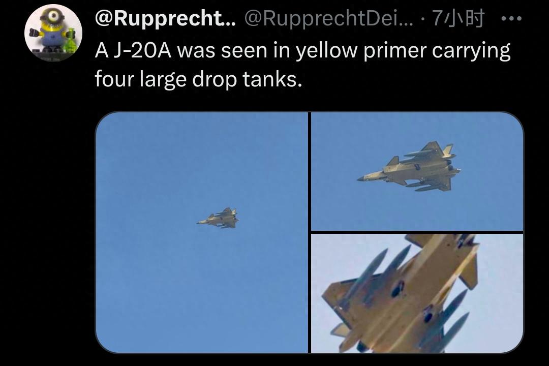 近日,德国军事专家鲁普雷希特注意到,互联网上出现了歼-20战斗机外挂4具大型副油箱飞行的相关画面。尽管早在多年前就曾有歼-20挂4奶瓶的画面出现,但也就见过那么一两回,相关画面应当仅仅是测试而已。