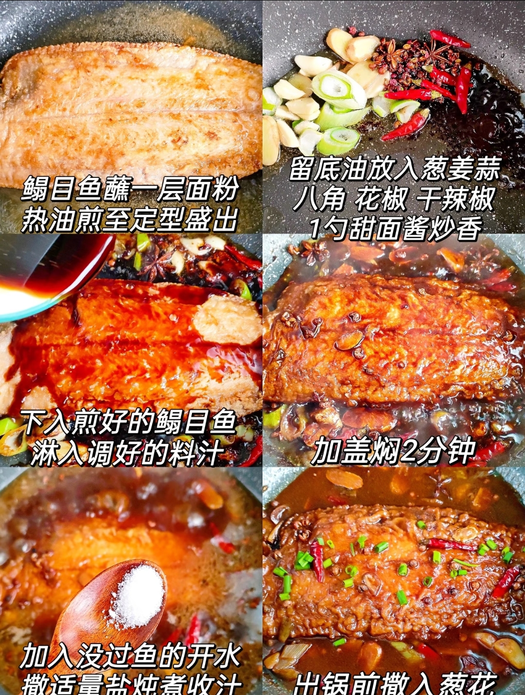 调味是赋予菜肴灵魂的关键步骤。取一小碗,调制黄金比例的料汁:少许白糖提鲜增亮,胡椒粉去腥暖胃,佐以两勺生抽提咸、一勺老抽上色,再配以两勺醋与三勺料酒,既解腻又增香。将所有调料充分搅匀,一碗集咸鲜酸甜于一体的灵魂料汁便准备好了。接下来是爆香环节,锅中留底油,投入葱姜蒜、八角、花椒与干辣椒,随着油温升高,辛香料的香气被彻底激发,此时再加入一勺甜面酱,炒出红亮的红油,这便是这道菜酱香浓郁的源头。随后下入煎好的鳎目鱼,立刻淋入调好的料汁,迅速加盖焖制两分钟,让鱼肉在蒸汽与料汁的双重作用下,急速吸收酱香精华,去腥入味。