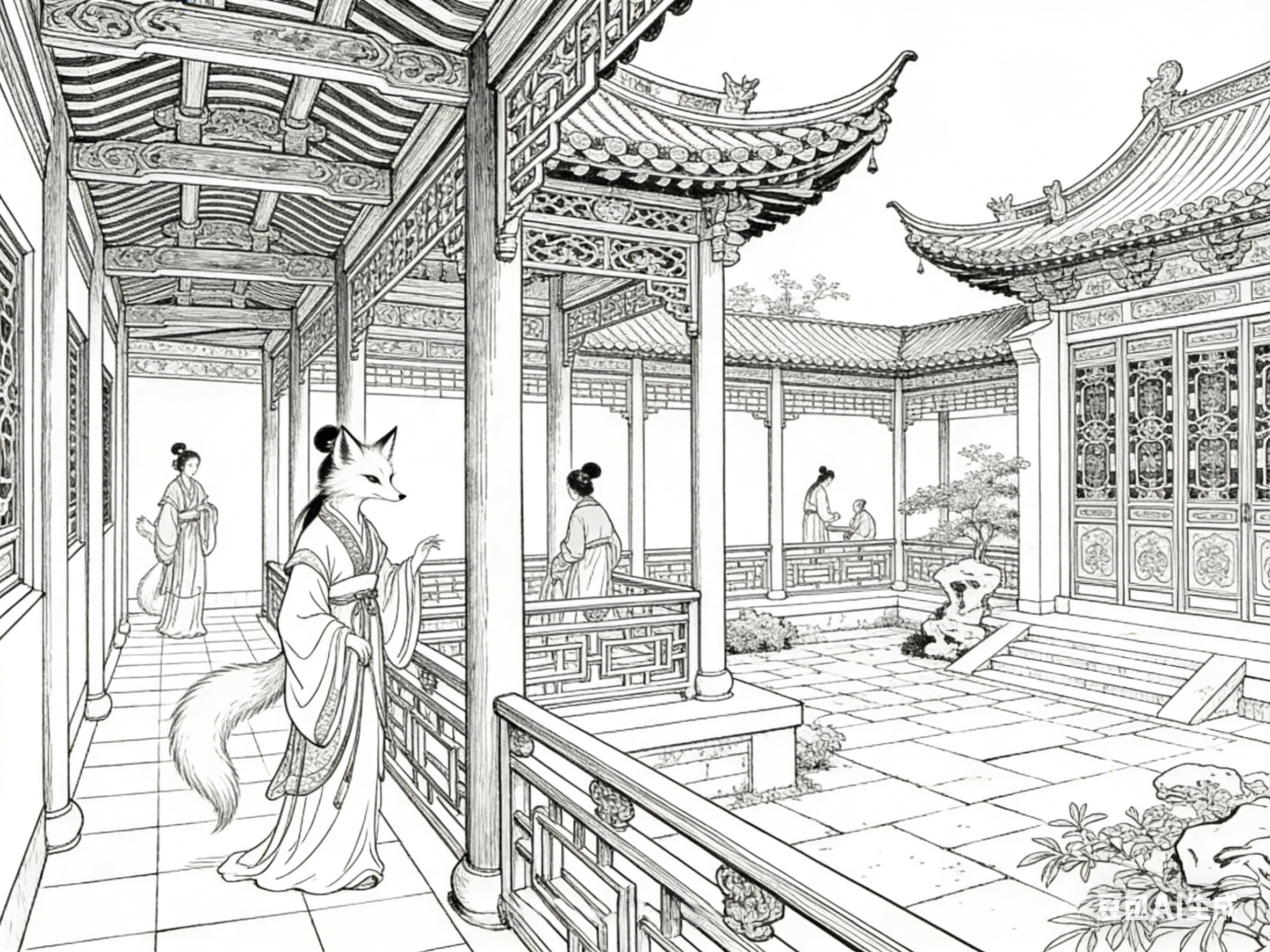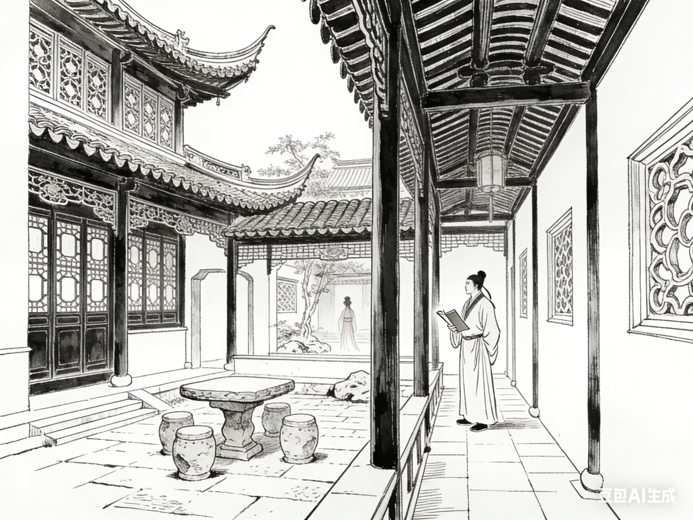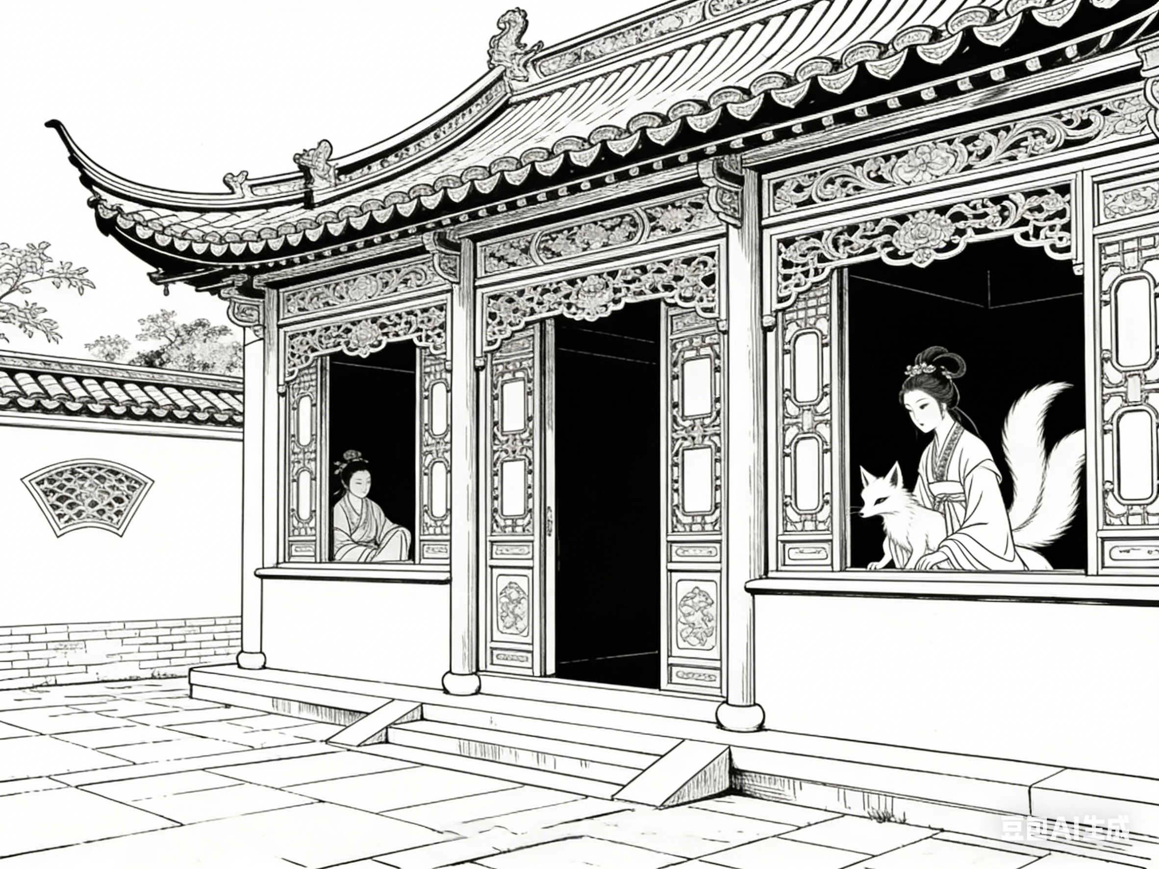 楼阁是古院中的核心建筑,也是《聊斋志异》中极具代表性的意象。楼阁多为两层或多层,木质结构,飞檐翘角,窗棂雕花,兼具居住、观景、藏书等功能,其意象内涵与故事主题紧密相连。