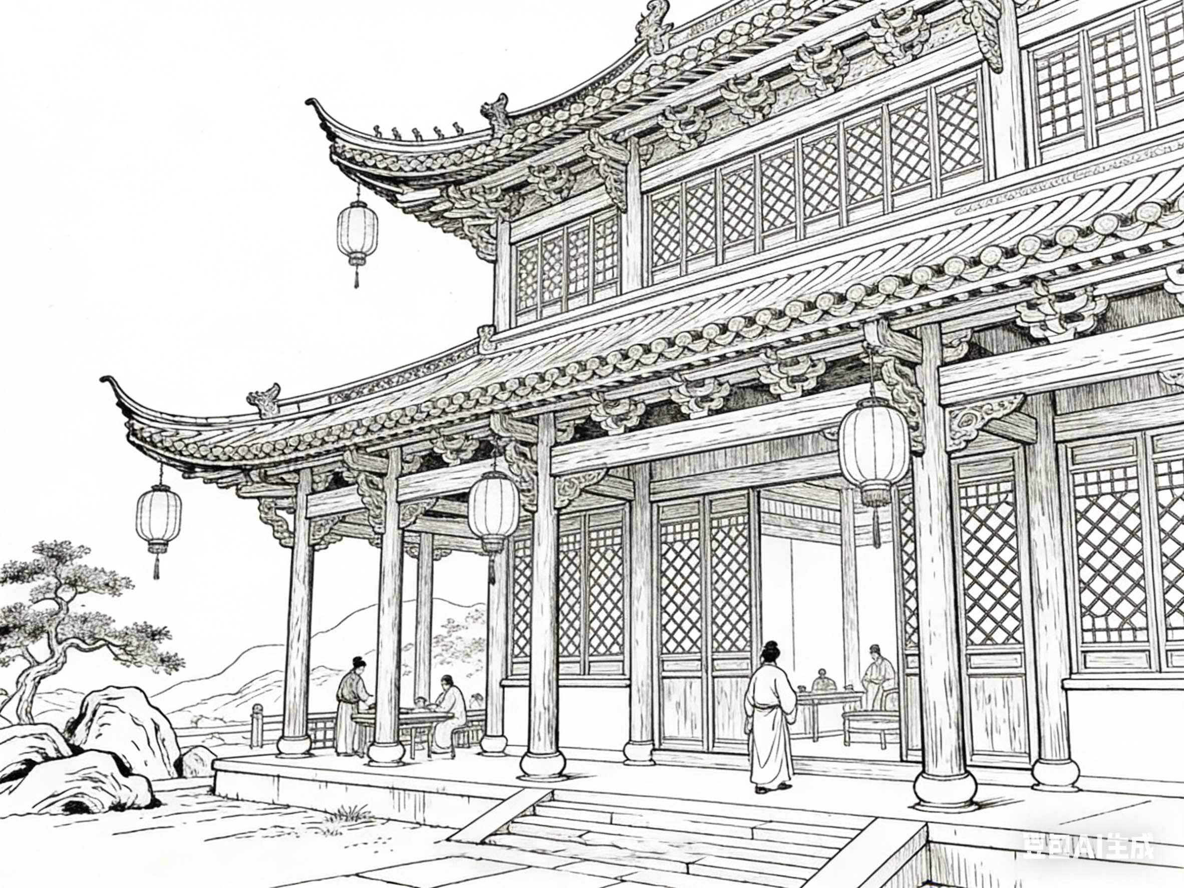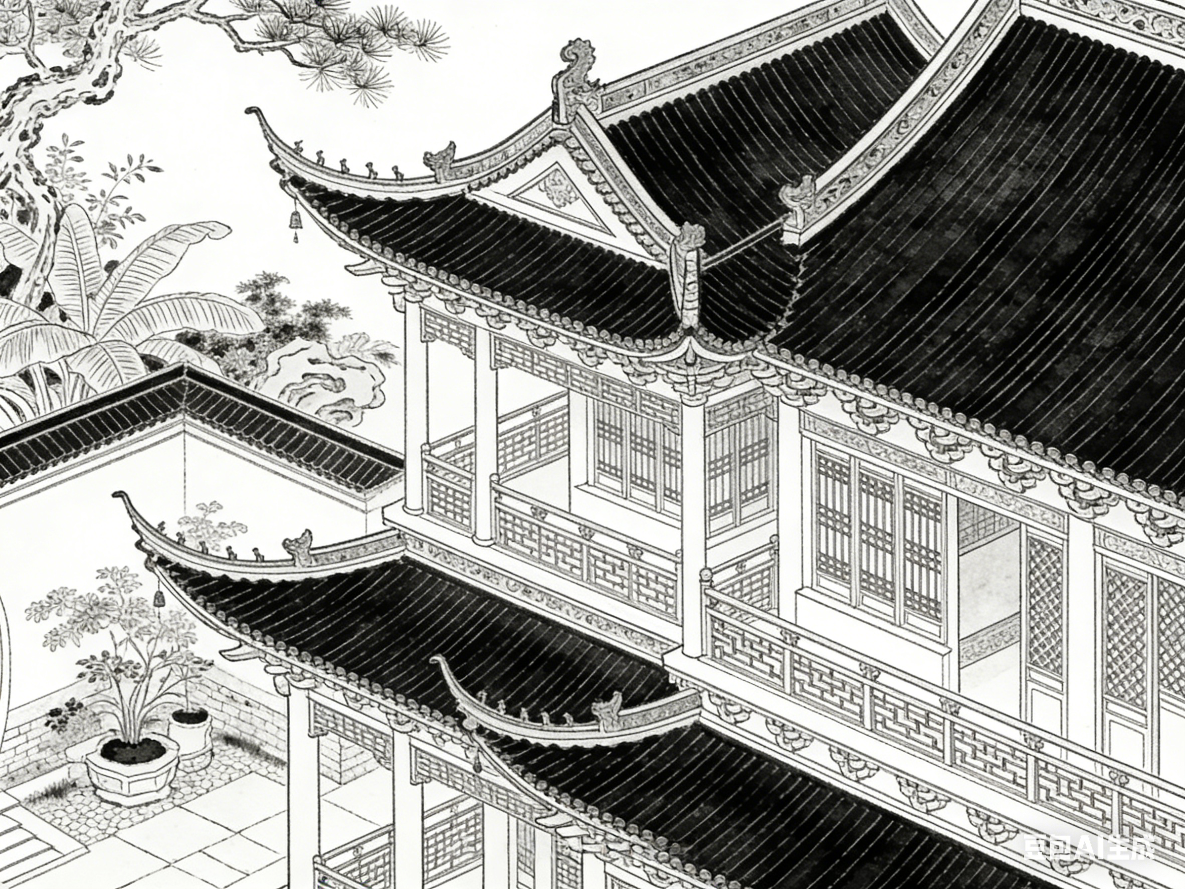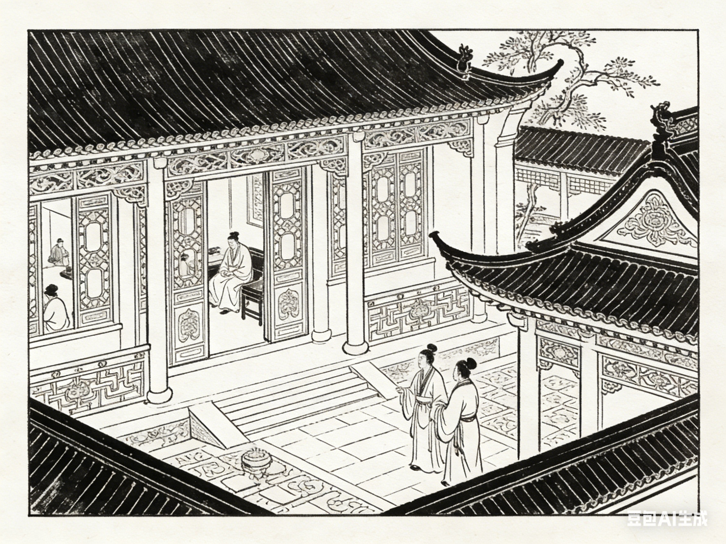 楼阁是古院中的核心建筑,也是《聊斋志异》中极具代表性的意象。楼阁多为两层或多层,木质结构,飞檐翘角,窗棂雕花,兼具居住、观景、藏书等功能,其意象内涵与故事主题紧密相连。