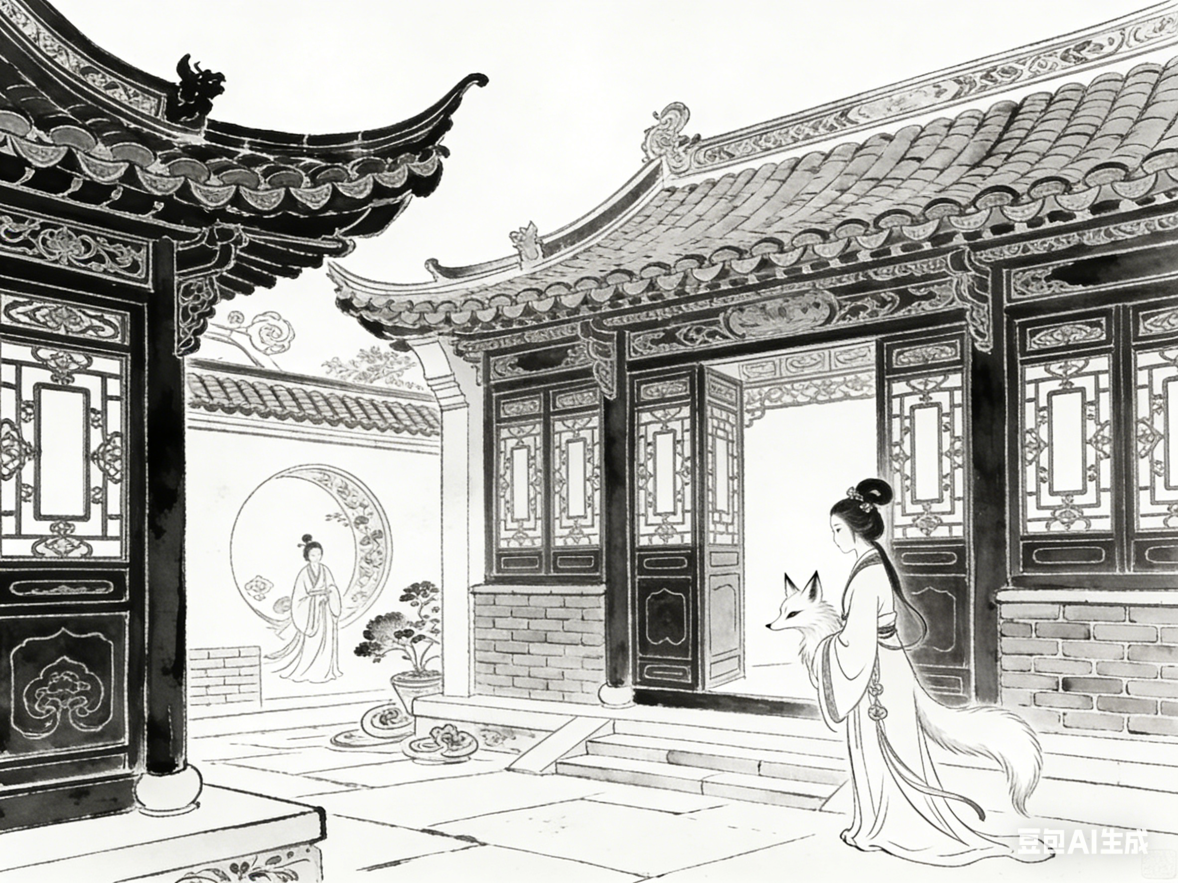 寻常小院多为书生、平民居住,布局紧凑,青砖灰瓦,柴门竹篱,充满人间烟火气。这类小院往往简洁朴素,无过多装饰,却暗藏温情与灵异。它们是书生苦读的居所,也是狐女、花仙下凡结缘的地方,承载着浪漫的爱情与真挚的情感。