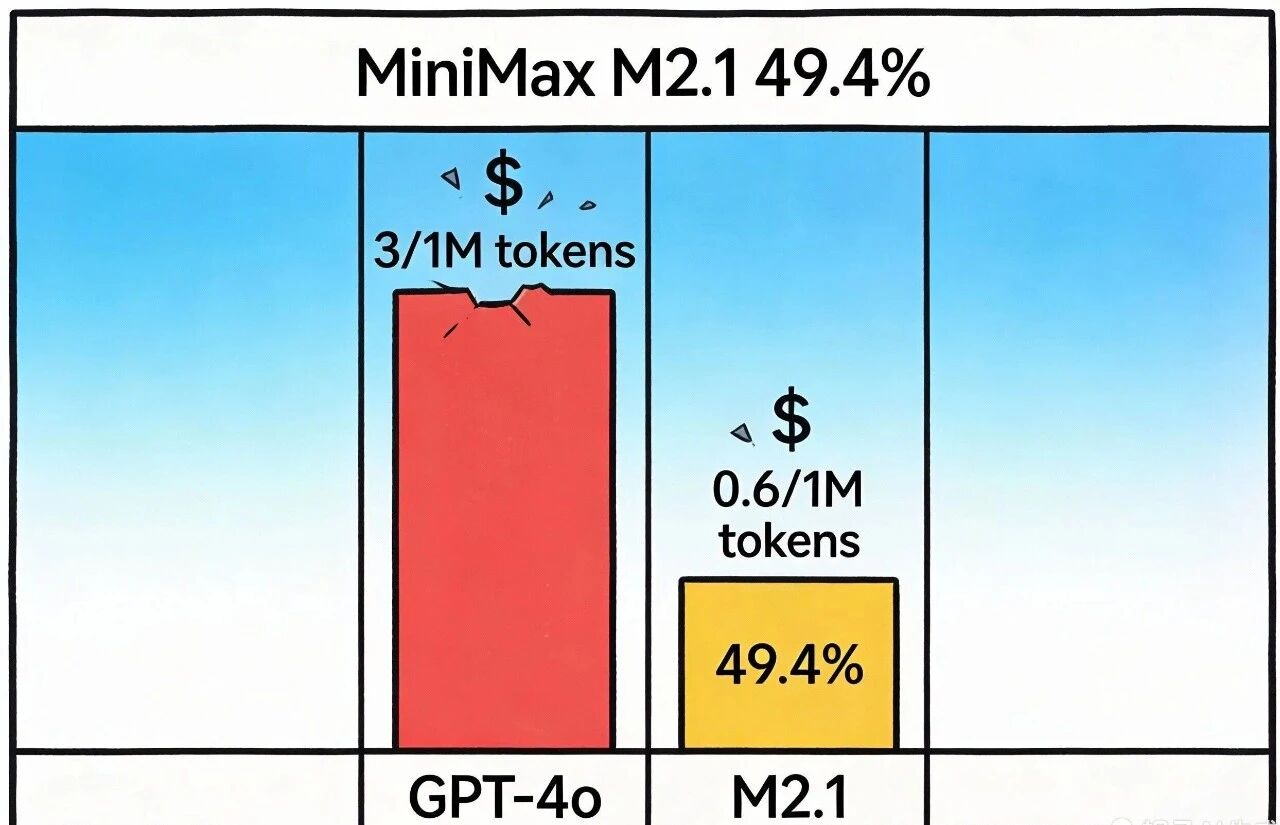 :M2.1的推理成本仅为GPT-4o的1/6(0.6美元/百万token vs 3美元/百万token)