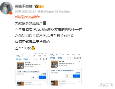 用携程查一家酒店,价格显示一晚两千四百多,朋友用另外一个app查才一千八百多;