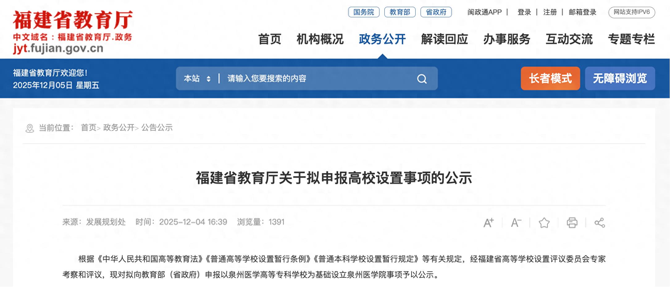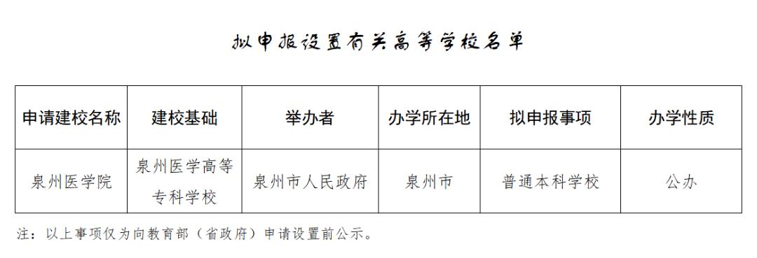 12月4日,福建省教育厅发布《关于拟申报高校设置事项的公示》。