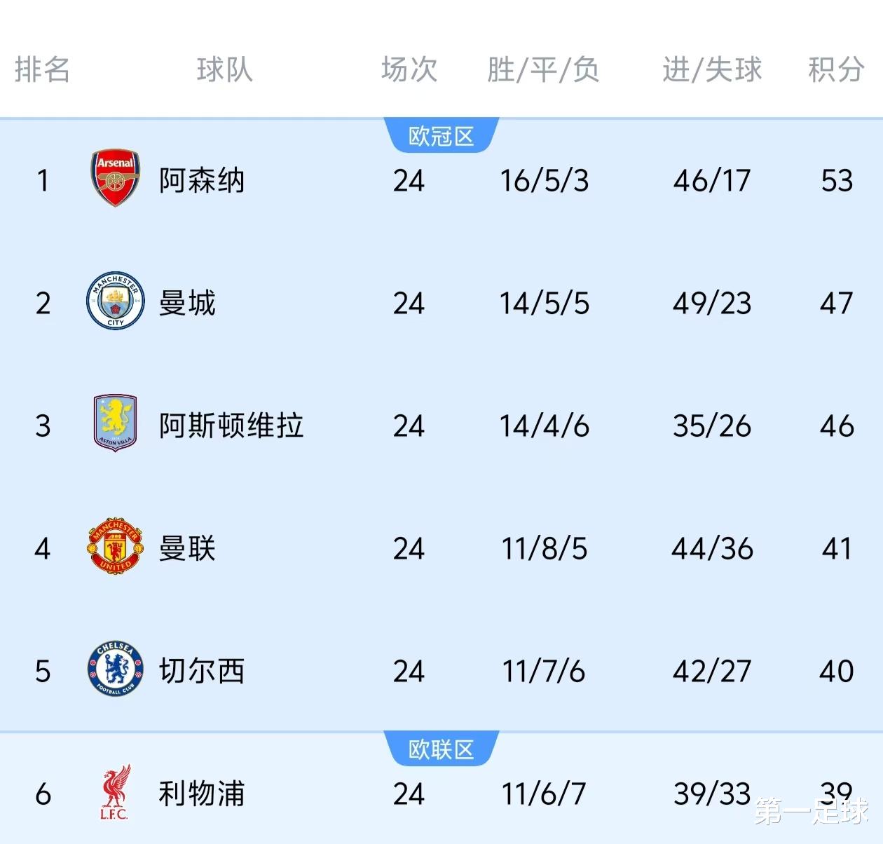 最新积分榜上,阿森纳积53分排名第一,曼城积47分排名第二,维拉积46分排名第三,曼联积41分排名第四,切尔西积40分排名第五,利物浦积39分排名第六,不得不说的是,联赛还是最考验球队整体实力的,传统BIG6球队,除了热刺外,全部进入英超积分榜前六。