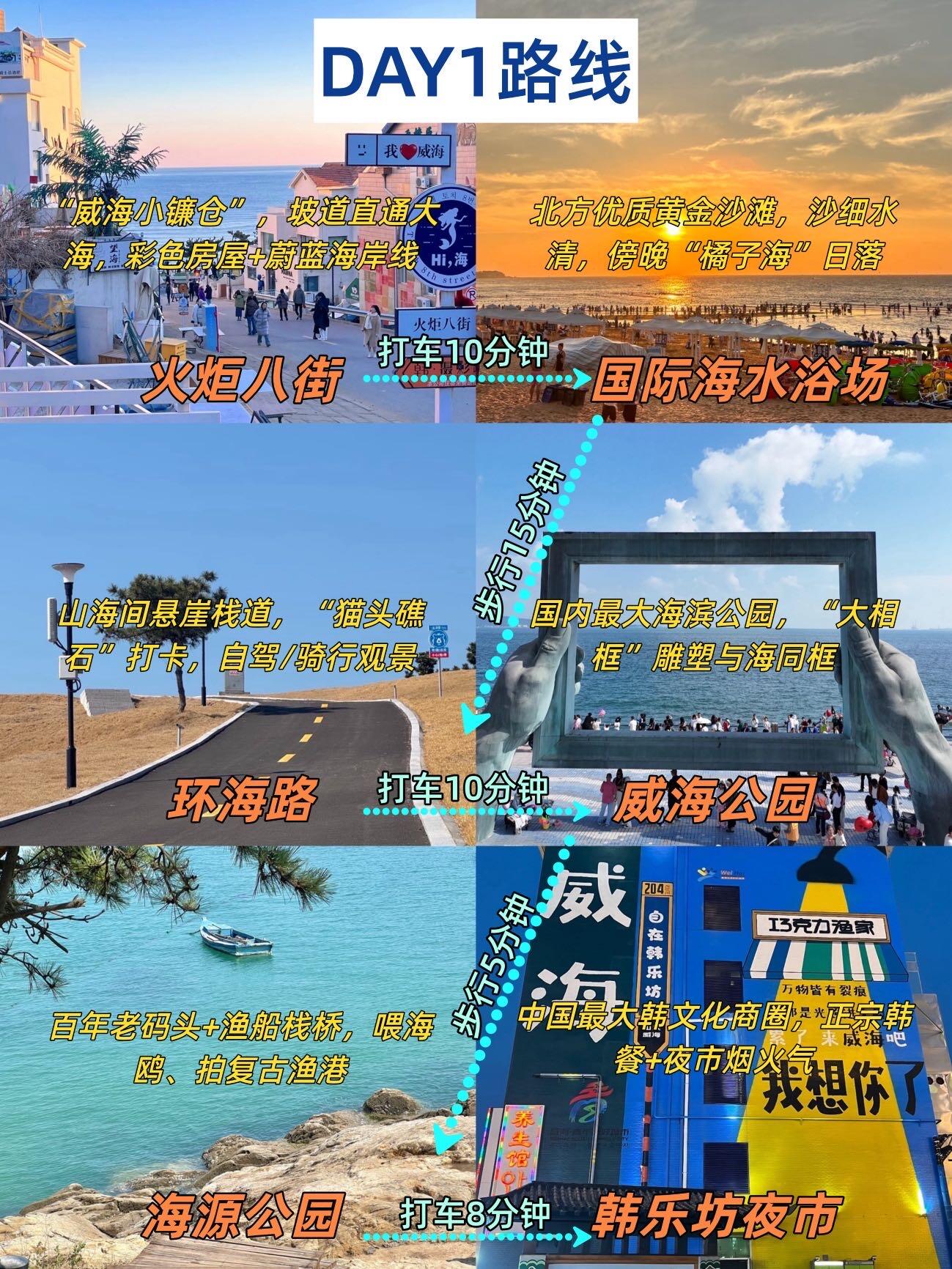 火炬八街 → 国际海水浴场 → 环海路(猫头山2号观景台) → 威海公园 → 海源公园 → 韩乐坊