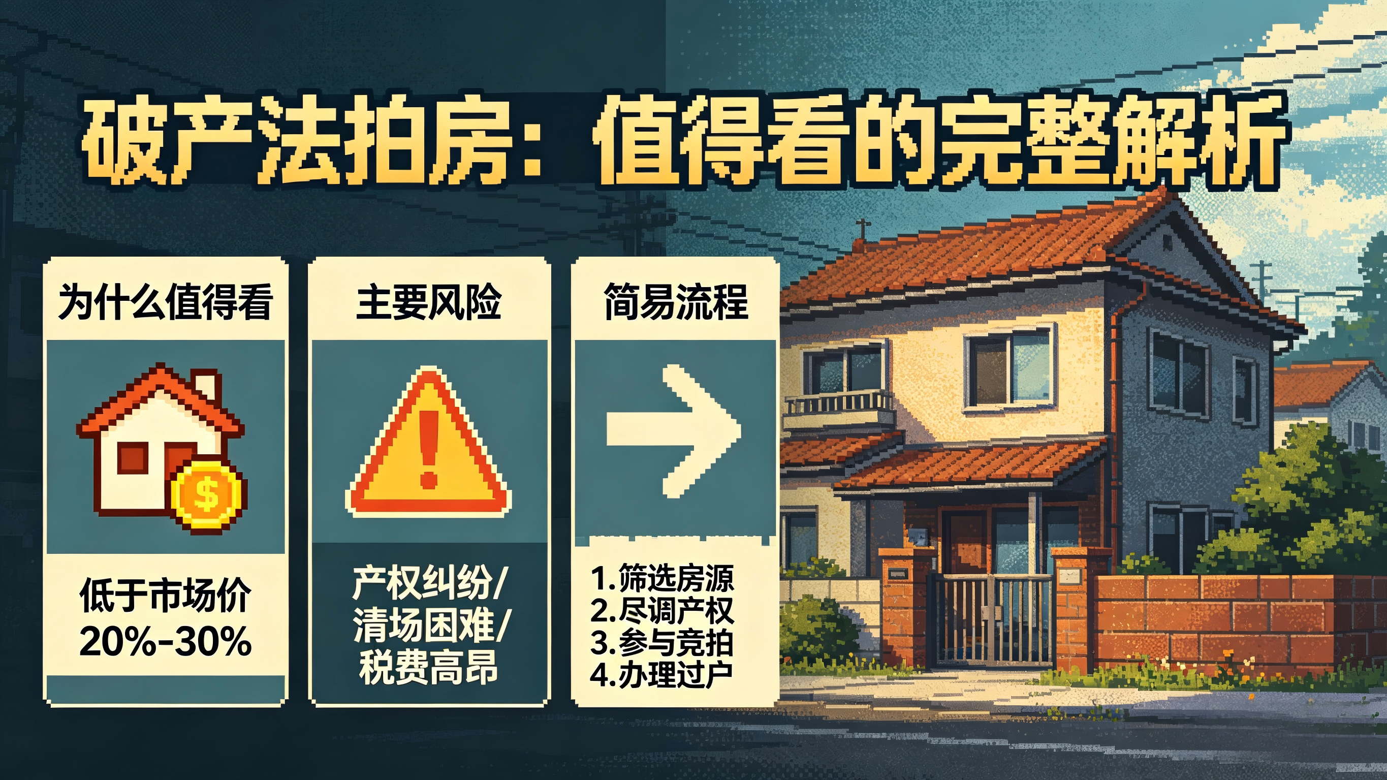 很多人看到“破产”俩字就绕道,觉得肯定很麻烦。其实,破产清算类房产往往是法拍市场上折扣最大、权属最干净的一类。今天用300字说清楚:它好在哪?坑在哪?怎么买?