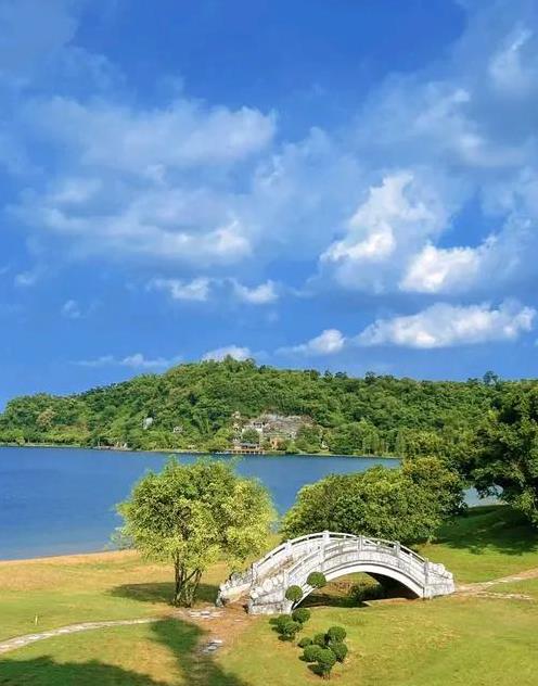 静湖湖水清澈,明净如镜,周围绿树环绕,群山拥翠,古刹依傍。西南侧断岩峭壁,清晰可见当年火山爆发形成的火山灰岩层。