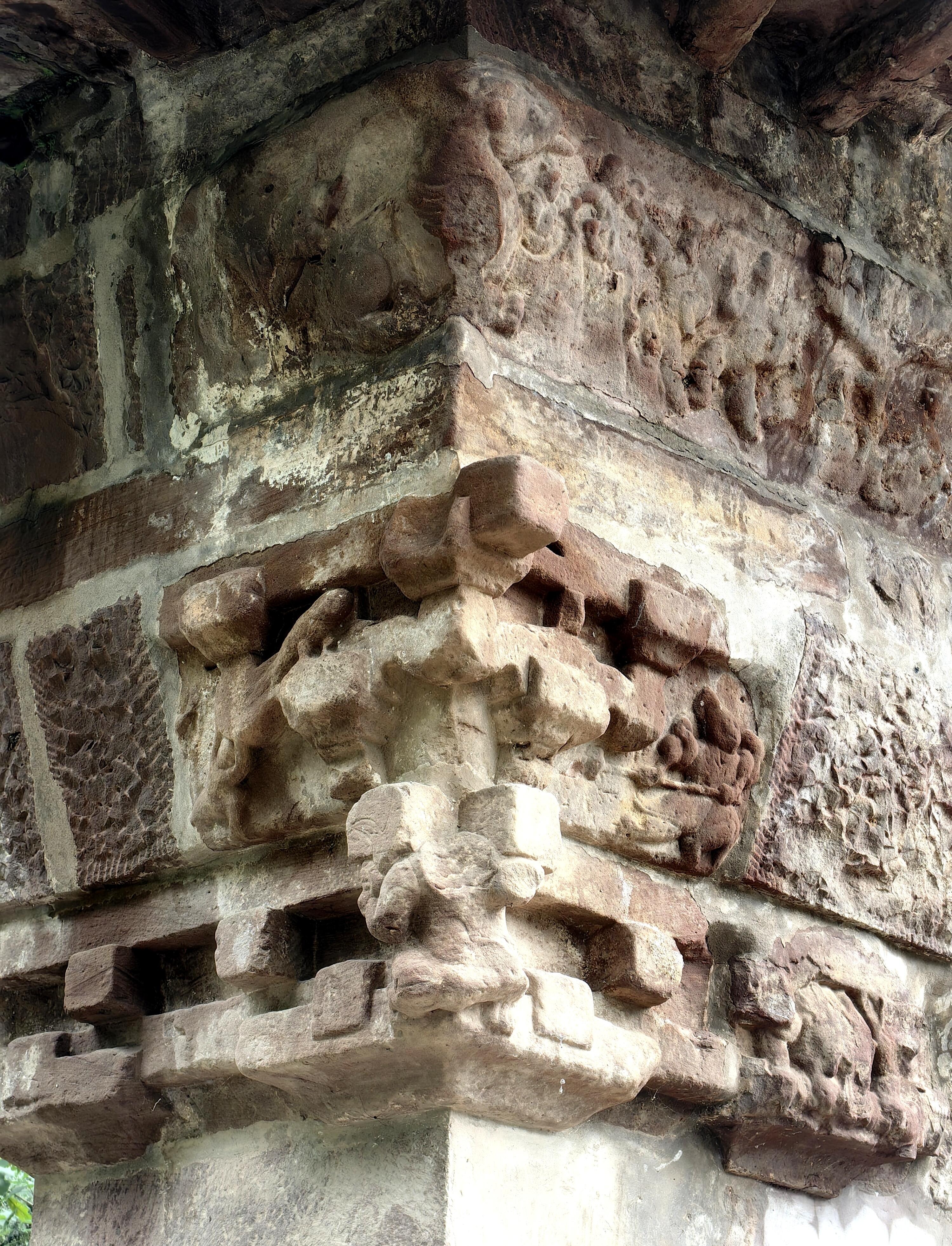 推开门的瞬间,时光仿佛慢了下来。院子不大,青石板路被岁月磨得有些光滑,尽头处最先看到的,就是那座孤零零的樊敏阙左阙。它西南朝向,由主阙和副阙两部分组成,像一对并肩站立的卫士,主阙高5.32米,副阙高3.31米,自下而上分为座、壁、楼、檐、顶五部分,全用石料仿木结构镌刻叠砌而成。走近看,主阙的十三层石料层层分明,石缝间的灰浆早已与石料融为一体,指尖触到石碑表面,能感受到粗糙的石纹,还有岁月留下的风化痕迹。最惊艳的是檐下的浅浮雕,转角处刻着双手托拱的力士像,虽历经两千年,力士的肌肉线条仍清晰可见,双手稳稳托着斗拱,仿佛下一秒就要发力,将整座阙体牢牢撑起。
