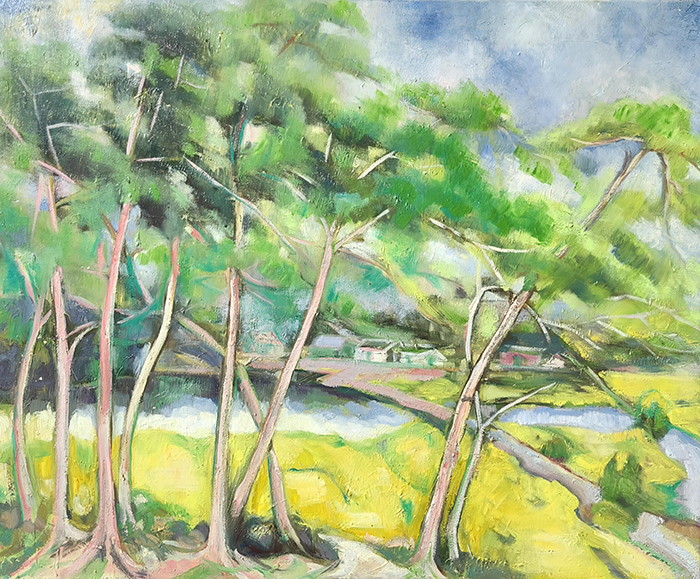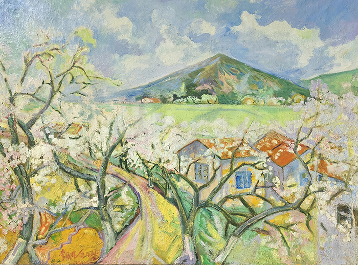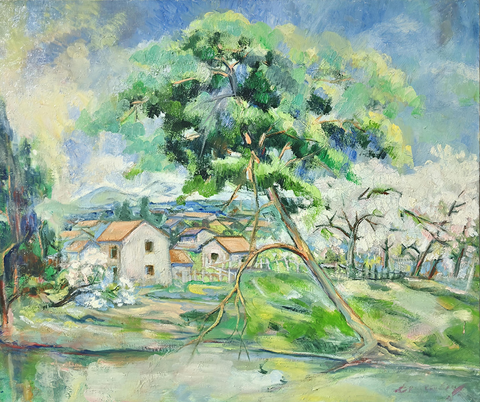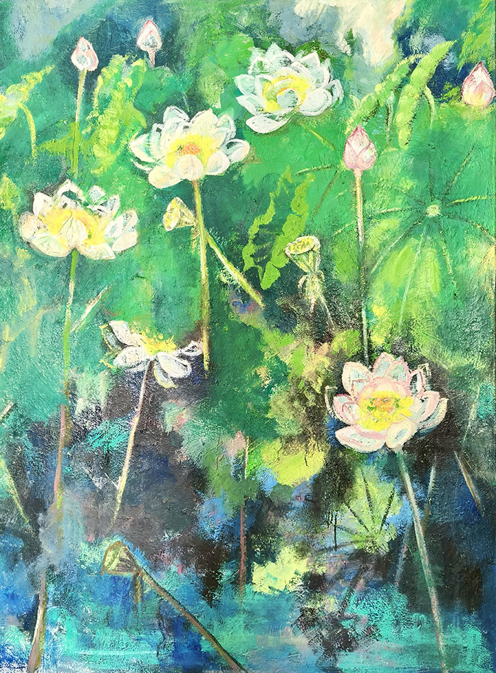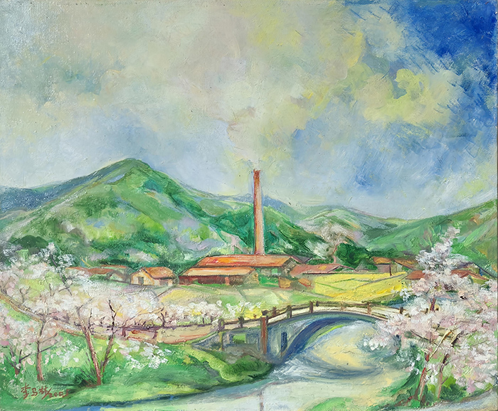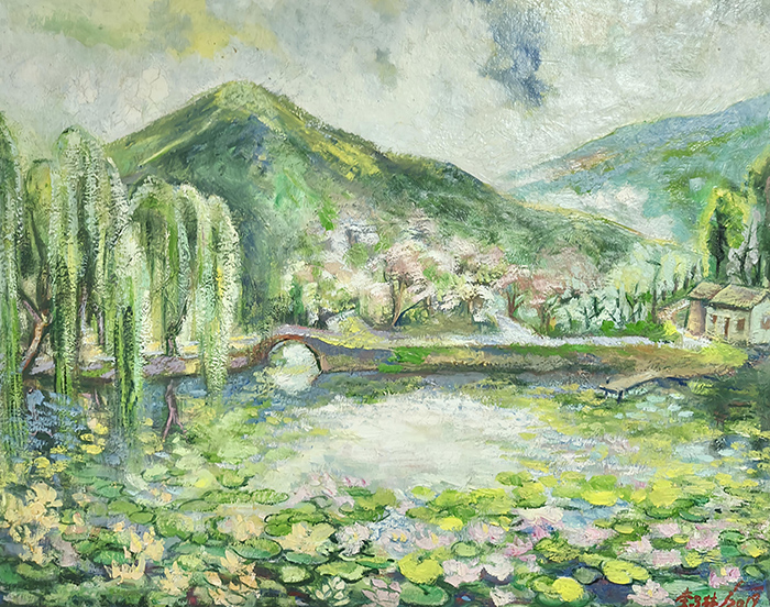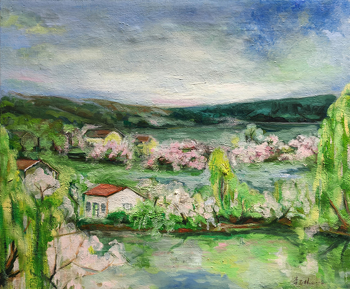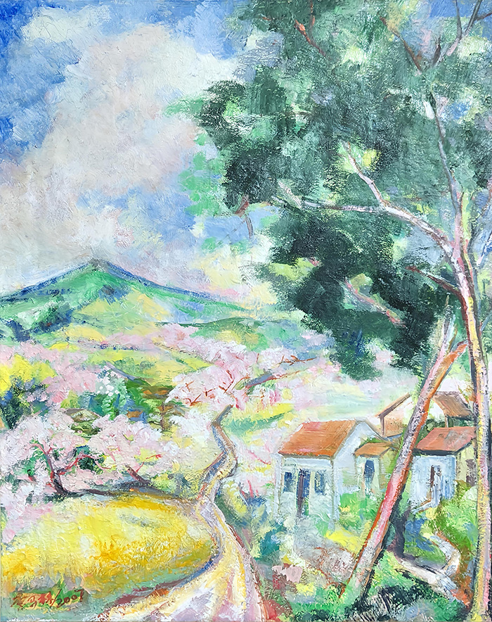 水彩敏感的油画延伸:他对色彩的“高敏感度区分”(如花瓣的粉白渐变、山峦的冷暖色层),将水彩“明净、灵动”的特质融入油画创作。画面中无“浊污之色”,色彩层次细腻如丝,既保留了油画的“厚重质感”,又兼具水彩的“通透生机”——这种“跨媒介技法融合”,拓展了油画的表现力边界,为现代绘画的“技法杂交”提供了实践案例。