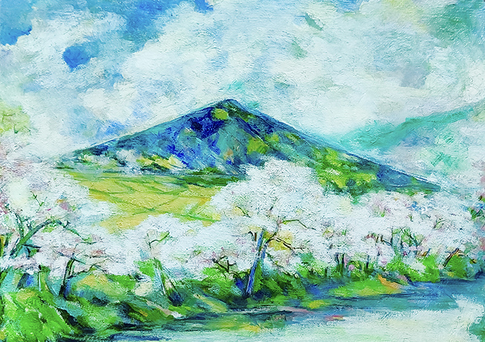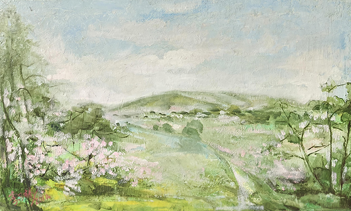 诗意空间的沉浸式营造:画面从“近花”到“远山”的空间层次(粉白繁花→黄绿田野→青绿山峦→灰白云朵),构建出“从细腻生机到宏大静谧”的诗意纵深感。观者仿佛“步入春日山谷”,获得心灵疗愈——这种“审美共鸣”的营造,证明现代绘画可超越“形式实验”,回归“精神疗愈”的本质,为“艺术疗愈”“美学减压”等当代议题提供了视觉方案。