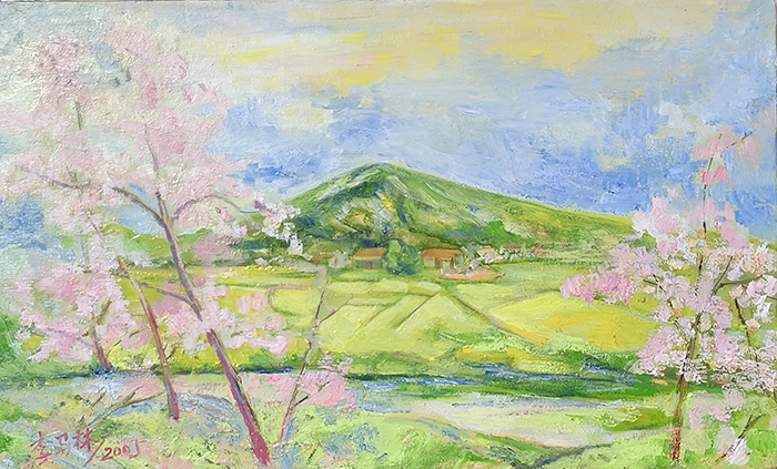 水墨意境的油画转译:画面中山峦的“空灵雄浑”、繁花的“诗意朦胧”,借鉴了中国山水画“留白、气韵”的审美逻辑(如传统山水“远山含黛、近花含情”的意境),但通过油画的厚涂肌理、色彩并置实现(如云朵的蓬松感以油彩堆叠,繁花的柔美以粉白与青绿的色彩对比烘托)。这种“以油画写水墨意”的方式,打破了“油画写实、水墨写意”的媒介偏见,证明油画也能承载东方哲学的“空灵、含蓄”。