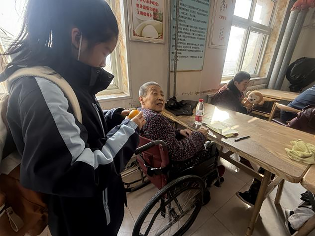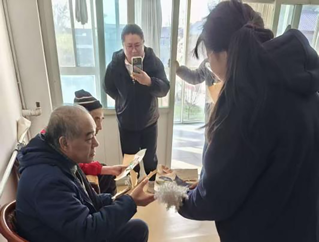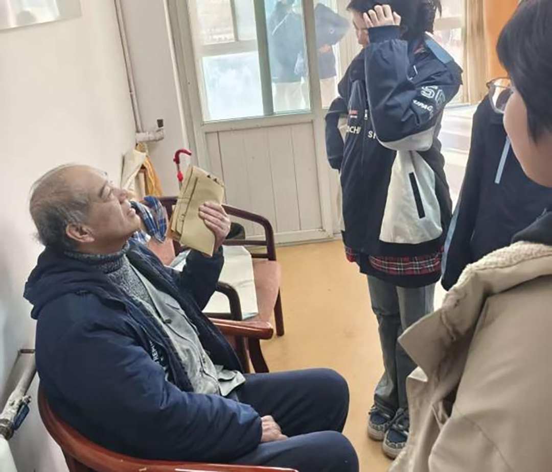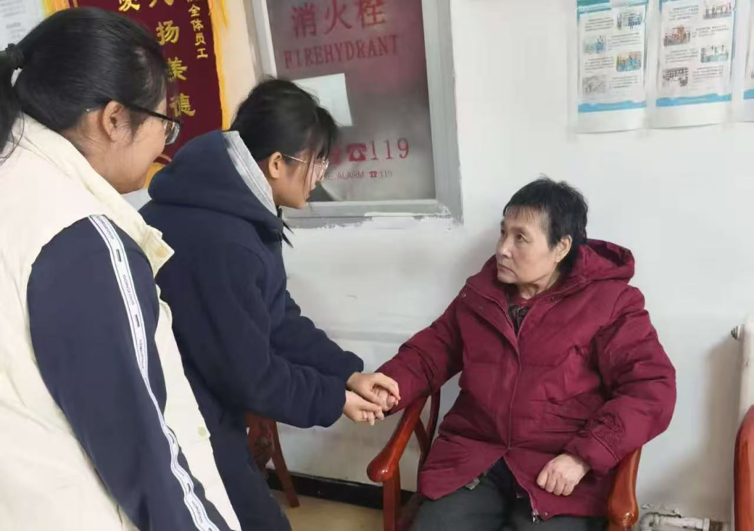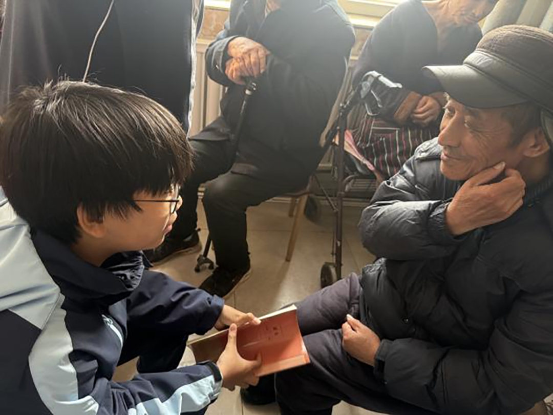 期间,初二(1)班的李晟睿见一位奶奶推着轮椅想在走廊里慢走,立刻快步上前,稳稳扶住轮椅扶手慢慢调整位置,与此同时,同班同学杨依涵、刘鸿冰、赖思静围在张奶奶身边,一会儿问 “奶奶您冷不冷”,一会儿讲学校里的趣事,把奶奶逗得笑声不断;赵骏霖、苏东岳等同学还主动帮视力不好的爷爷读起了报纸,轻声慢语格外耐心。