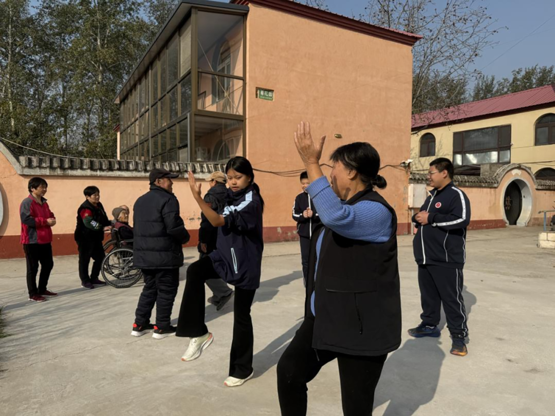 “爷爷奶奶,咱们一起活动活动筋骨吧!” 体育老师的声音响起,一场温馨的 “健身小课堂” 随即展开。老师站在中间,带着同学和老人们打起了健身长拳,边做动作边细致讲解:“手臂要自然抬起,膝盖慢慢弯曲,不用着急,跟着节奏来。”