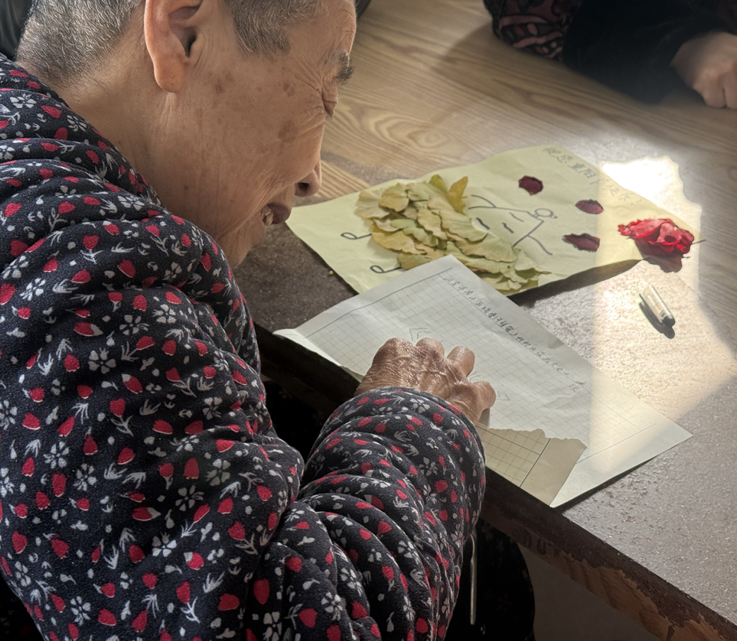 刚走进养老院大厅,同学们就迫不及待地拿出提前精心准备的贺卡。这些贺卡没有华丽的包装,却满是用心:有的手绘着憨态可掬的长寿龟,有的用彩笔写满 “爷爷奶奶安康”“祝您重阳节快乐” 的暖心话语,还有的贴上了晒干的银杏叶,留住秋日的温柔。