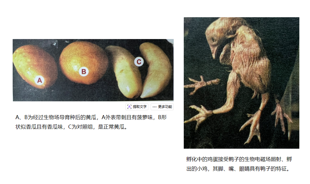 姜堪政博士早年的实验更令人瞠目:将香瓜幼苗与黄瓜植株置于生物场导舱中,黄瓜果实竟呈现出香瓜的典型风味与成分;类似地,鸭胚胎的生物信息场,竟使发育中的鸡足趾间长出了鸭蹼结构。这意味着,遗传性状可不通过DNA交换,仅凭“信息场共振”实现跨物种传递。