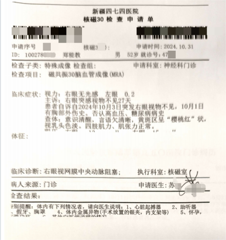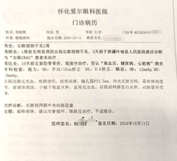 为了查明病因,郑能教拖着病体辗转多地,叶城县人民医院、怀化爱尔眼科医院、湖南医药学院总医院、陆军第九五O医院、新疆四七四医院等多家医疗机构就诊。所有医院的诊断都指向同一个结果——右眼视网膜中央动脉阻塞,部分医院还确诊了右眼远达性视网膜病变、黄斑病变等关联病症。