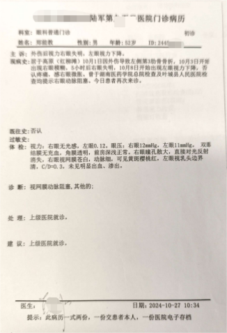 更让人揪心的是,至2024年10月底,郑能教右眼已彻底无光感,左眼视力仅余0.2,还伴随口齿不清的症状,彻底丧失了劳动能力。而查阅其过往病史,他并无高血压、糖尿病等可能诱发此类眼部疾病的基础病史。