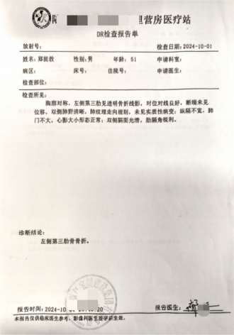 事发后,郑能教被紧急送往陆军第九五O医院诊治,诊断结果为左侧第三肋骨骨折。后续,经鉴定其伤残等级为十级,无生活自理障碍。