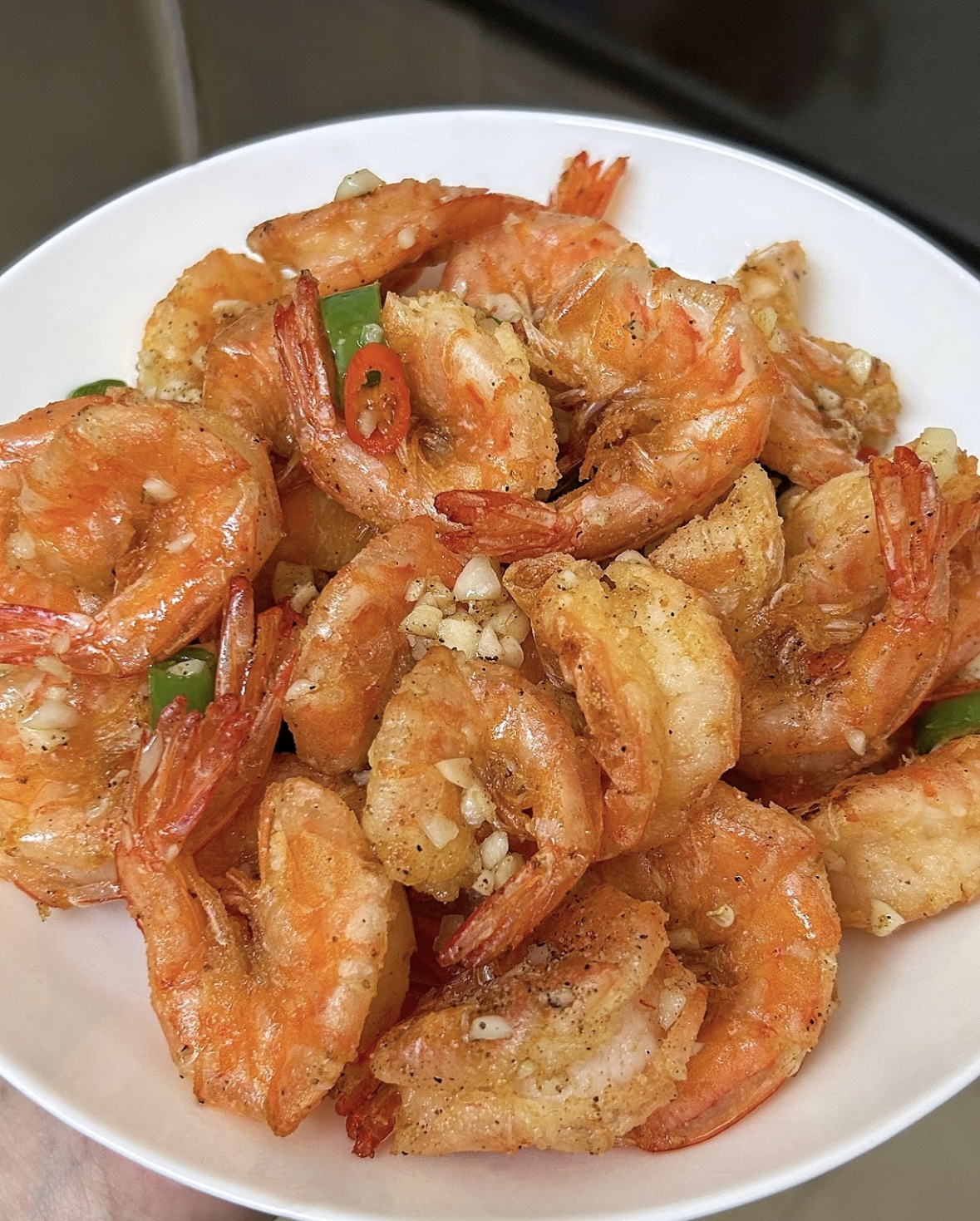 锅里留一咪咪底油,蒜粒先下锅,“滋啦”一声像开场的锣鼓,蒜香瞬间膨胀,辣椒圈紧随其后,红绿在热油里翻滚,像迷你圣诞彩灯。把炸好的虾倒回锅里,火调到最大,动作要快,姿势要帅,一勺椒盐粉潇洒撒下,翻锅、抖勺、颠铲,三下五除二,每只虾都均匀裹上“黄金甲”。椒盐粉现磨最香,花椒微麻、海盐微咸,混着辣椒的火热,像给虾穿了件“带刺的玫瑰外套”,又飒又撩。