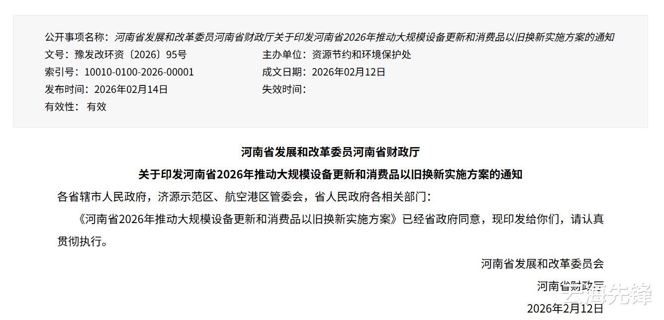 近日,河南省发展和改革委员会、河南省财政厅联合印发《河南省2026年推动大规模设备更新和消费品以旧换新实施方案》(以下简称《方案》),明确提出到2026年底,力争完成个人消费者汽车报废和置换更新50万辆左右,家电产品以旧换新500万台左右,进一步释放数码和智能产品等消费潜力。