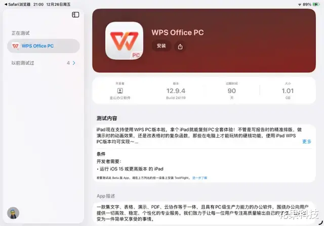 不过当前 WPS office PC 还是内测版本,不能直接在 App Store 下载,要通过 TestFlight 安装,所以要提前准备好苹果官方的 TestFlight(在 App Store 安装即可)。