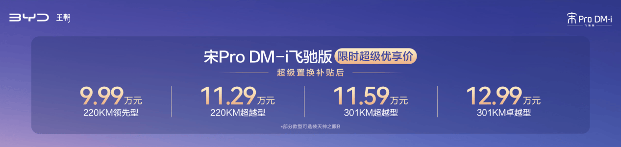 宋Pro DM-i飞驰版此次推出纯电续航里程220km及301km两个版本共4款车型。其中,220KM领先型售价9.99万元起,强势引领超200公里纯电续航的插混SUV进入9万级时代。