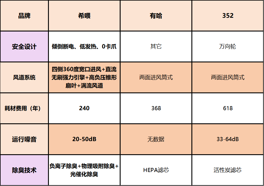 希喂更偏向为养宠场景定制,浮毛和异味处理都更主动;352整体表现稳,但节奏偏慢;有哈适合轻度养宠或对净化强度要求不高的家庭。