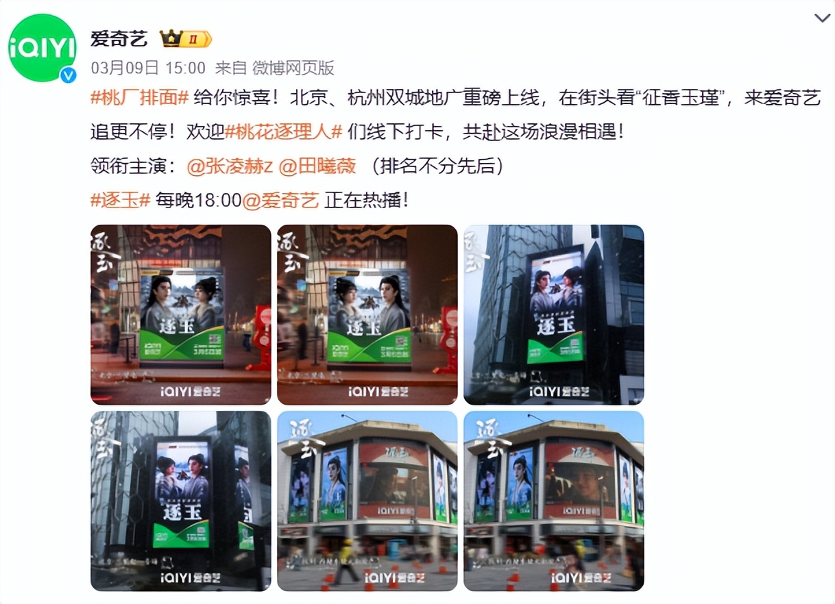 不止线上,线下也处处能偶遇《逐玉》的惊喜。国内的“桃花逐理人”能打卡各式线下《逐玉》地广,海外的观众一抬头,也能看到我们征香玉瑾的盛世美颜,实打实的国剧文化输出。