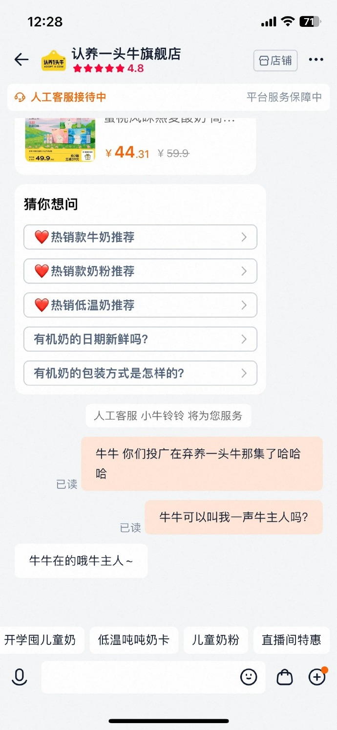 认养一头牛精准接住剧粉玩的“弃养一头牛”梗,全程和观众双向奔赴,品牌还可爱地收留心碎剧粉,客服真的一口一个“牛主人”给足了情绪价值。