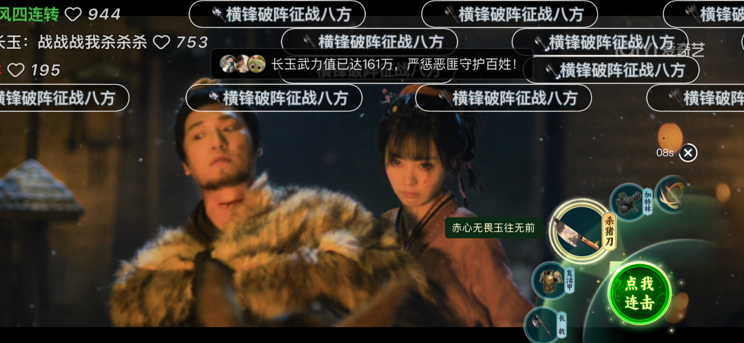 不止有玩梗,追剧的仪式感也被拉满:爱奇艺上甜到齁的名场面会触发爱心特效,酣畅淋漓的打戏还会弹出互动战斗页面,让观众跟着“参战”给主角加武力值。