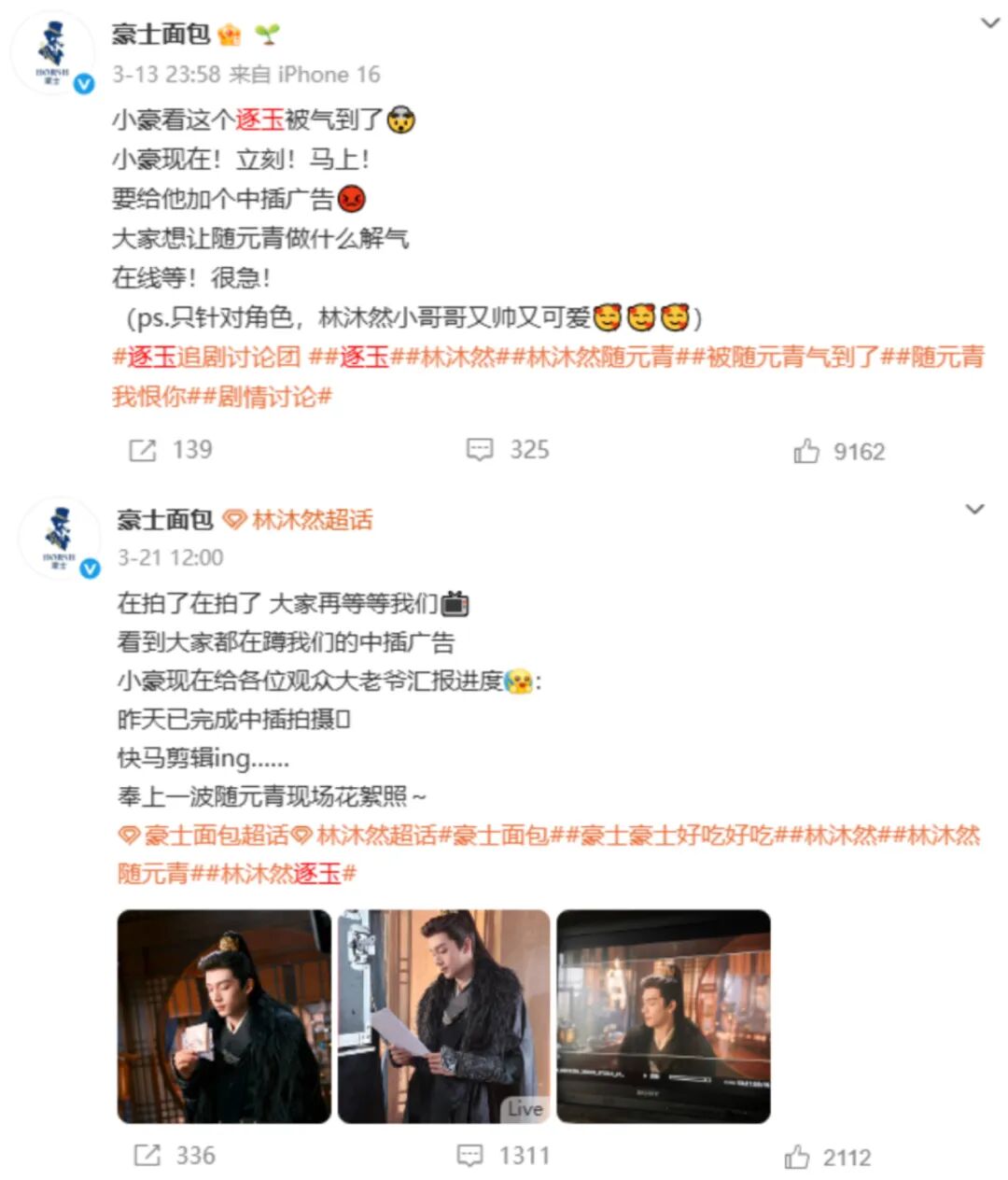 连豪士面包都是半路狠狠“上车”,不仅邀请剧中随元青扮演者林沐然担任品牌挚友,还专门为了剧粉拍了专属中插广告,全程直播式报告进程,主打一个陪伴!