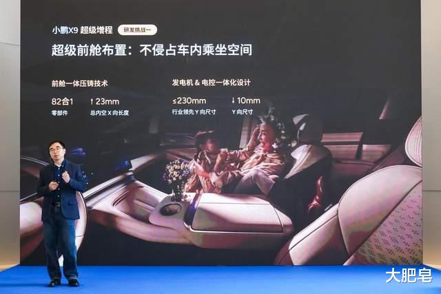在联合研发攻坚战中,首先要面对的是挑战布置空间,小鹏X9超级增程如何实现行业最高集成度,不侵占座舱空间?小鹏X9超级增程前舱布局紧凑,在不压缩座舱乘坐空间的前提下,小鹏汽车与华为选择通过发电机与电控的高集成度设计,将发电机Y向尺寸极致压缩至≤230mm。结合小鹏汽车的前舱一体压铸技术,实现零部件82合⼀,总内空X向⻓度提升23mm,共同实现了前舱空间利用率的行业突破。
