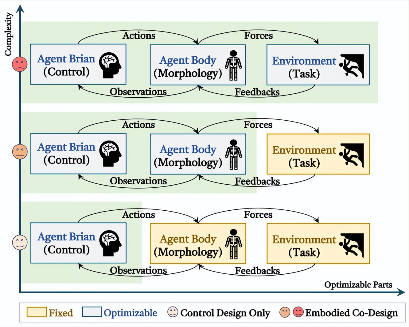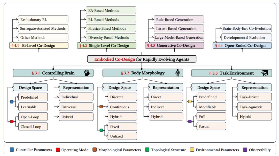 基于这个建模基础,其提出了一个两层的分类体系(Taxonomy)。底层聚焦于具身协同设计的三个基本要素:控制策略(大脑)、身体形态和任务环境。