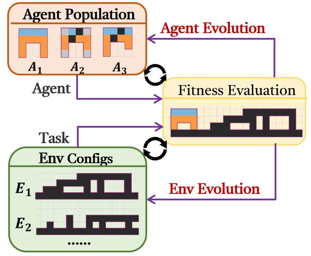 在这种模式之下,设计目标不再是完成某个固定任务,而是追求持续的能力增长和创新涌现。机器人所处的任务环境也会和机器人的身体和大脑同步进化。随着环境变得越来越复杂,也会不断逼迫机器人进化出来更加强大的形态和策略来应对。