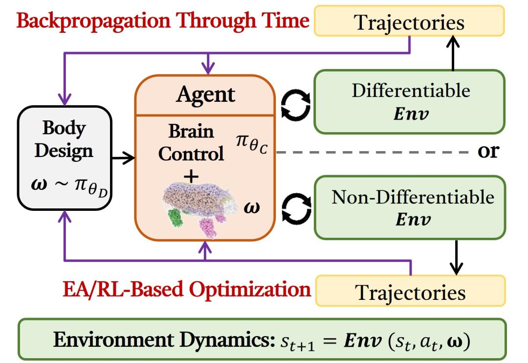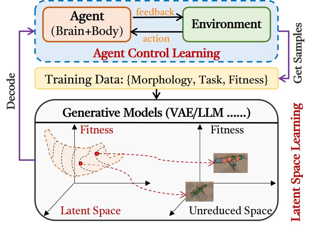 传统的机器人设计在这两方面往往是割裂的:先由人类工程师固定机器人的机械结构,比如设计成为双足或者四轮,再去开发控制软件驱动它。这就像先造好一辆形状固定的汽车再去训练司机。如果汽车本身设计不佳,即使是最好的司机也难以驾驭。