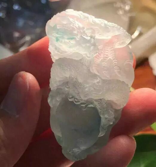 不得不说师傅的技术迅速既稳妥,不到半小时皮已完全褪去,接着又切出雕刻的部分,没有浪费一点料子,我们来看下这块小料,全通透不变种,种老肉细无裂纹,略带飘花