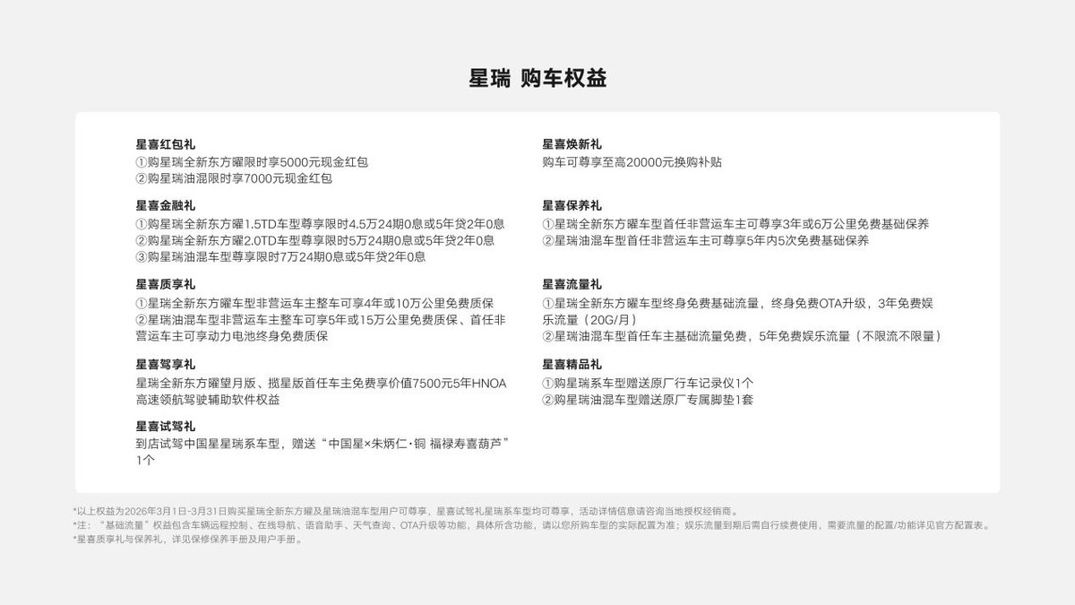 回到开头的问题:在新能源时代,星瑞全新东方曜凭什么持续领跑?答案或许很简单——它依然是一台没有明显短板的燃油车,同时在设计、智能、动力、安全四个维度做到了同级别的上限。当用户手持十几万预算,想要一台综合素质过硬、开出去有面子、用起来省心的轿车时,星瑞依然是那个绕不开的选择。2月13152辆的销量,正是用户用真金白银投出的信任票。